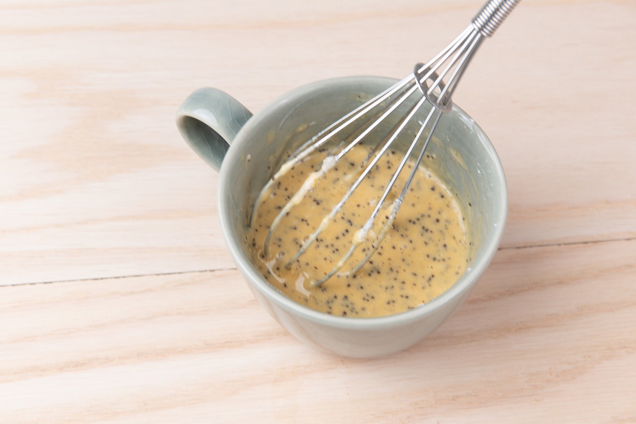 ② マグカップに卵、①、サラダ油、牛乳を入れて混ぜ合わせる。